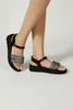 ARIZONA PLATFORM SANDALS are a variations of the classic Arizona design ' featuring an adjustable strap with buckles for a customizable fit . They incorporate a platform sole , adding height while maintaining the signature contoured cork footbed for comfort and support . These sandals combine a casual yet trendy aestheticShoes description