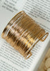 This chic cuff bracelet showcases a wide, multi-layered gold-tone design, blending contemporary style with timeless elegance. Its bold silhouette makes it a striking addition to any jewelry collection.