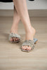 OMAHA NEO , a square toe sandal on our new comfortable yet chic 2 Inch block heel, is the essential slipper to take from day to evening wear. Metallic embossed upper embellished with sparkling crystals. OMAHA is the perfect luxury footwear that is entirely handmade.