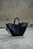 The tote bag in the image is a structured, medium-to-large sized handbag made from smooth, high-quality leather in black color. The design is both minimalistic and modern, featuring clean lines and subtle stitching along the front and handles.