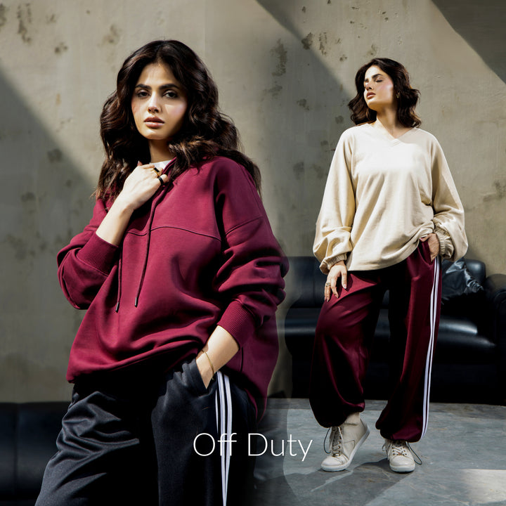 For the days that call for ease with attitude — The Off-Duty Edit brings oversized joggers, roomy tees, and clean white sneakers together in color stories that pop. Burgundy & black for edge, brown & yellow for warmth, and burgundy & skin for quiet cool.