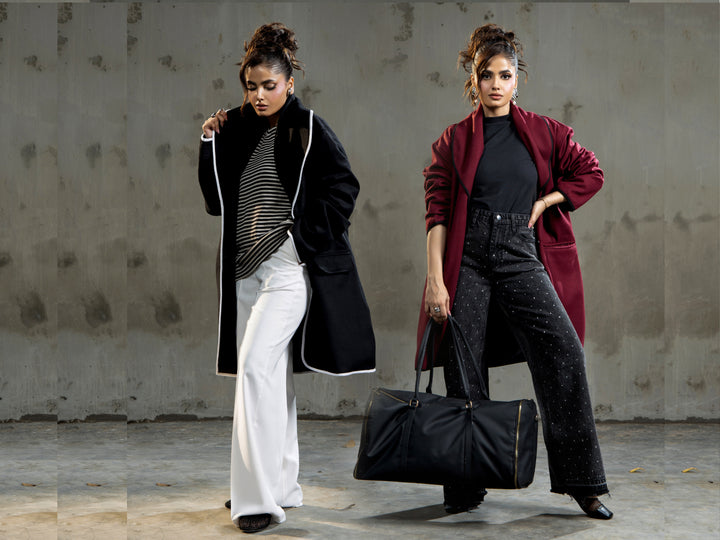 Where structure meets comfort. Urban Ease blends oversized tailoring with contrast-piped lapels and fluid wide-leg trousers — a look that says sophistication without trying too hard.