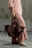 The tote bag in the image is a structured, medium-to-large sized handbag made from smooth, high-quality leather in a warm tan or camel color. The design is both minimalistic and modern, featuring clean lines and subtle stitching along the front and handles.