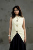 A contemporary sleeveless waistcoat crafted from structured fabric, featuring an asymmetrical hemline and bold statement buttons. The tailored fit and clean lines bring modern edge and sophistication — perfect for elevating both casual and formal looks.