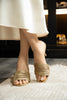 Elegant golden heels featuring multiple thin straps for a sleek, stylish look. Designed with a comfortable brown insole for all-day wear. Perfect for parties and special occasions. The warm brown insole provides a subtle contrast to the radiant gold finish, ensuring both style and comfort with every step.