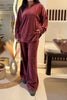 Design Detail A relaxed two-piece lounge set crafted in soft velour, the fabric gives velvety feel. Designed with a crew-neck top featuring a zip opening and wide-leg trousers for an effortless off-duty fit.
