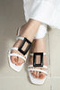 Step into sophistication with these chic white strappy sandals, designed to blend minimalism with a statement edge. Featuring sleek, double straps and an eye-catching black geometric buckle, these sandals add a modern touch to any outfit. The square-toe design ensures a contemporary aesthetic, while the cushioned sole offers all-day comfort.
