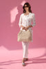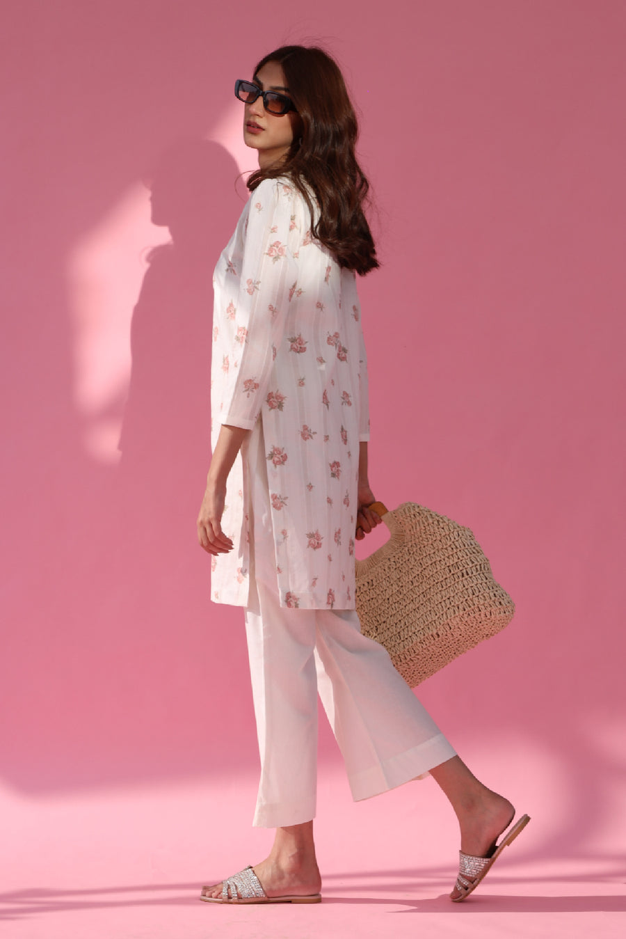 printed doriya fabric shirt featuring heart shaped neckline and basic sleek silhoutte comes with trouser.